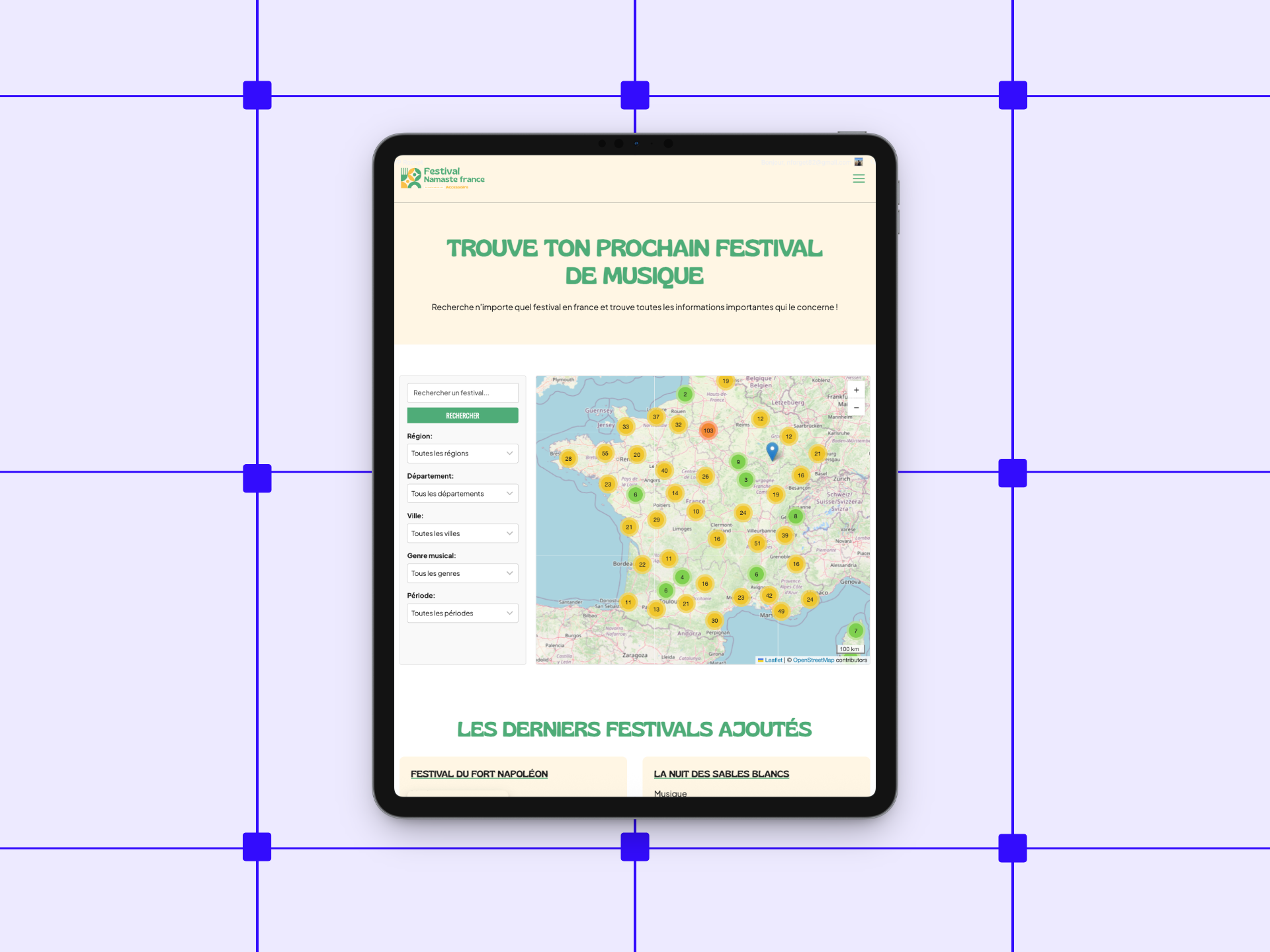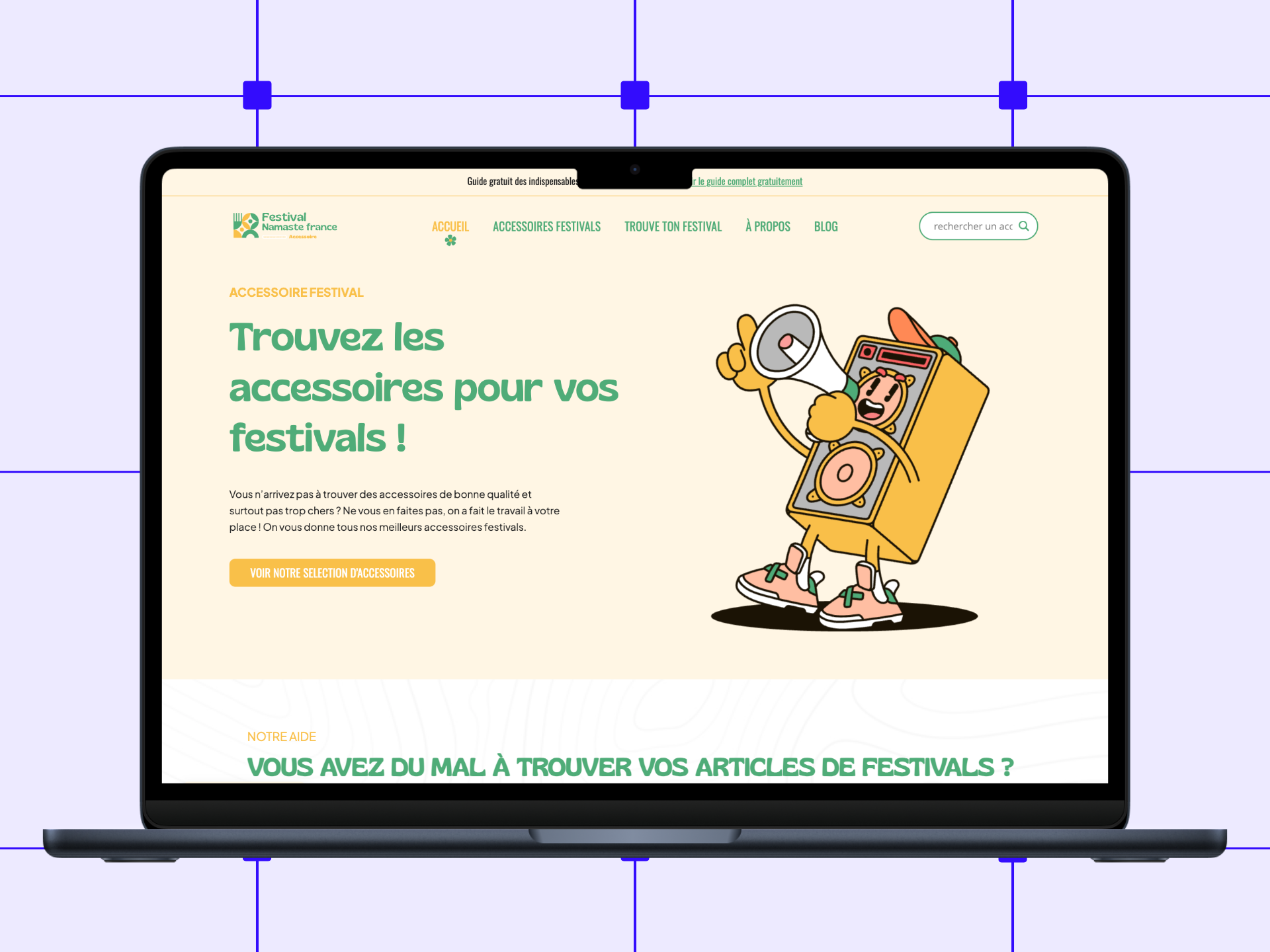 Création graphique et intégration de ce site d’affiliation autour du thème des festivals. Vous y retrouverez la liste de tous les festivals de France avec une carte développée sur mesure. Ce site fait référence de tous les meilleurs produits pour un festival. Un énorme travail autour du SEO a été fait.