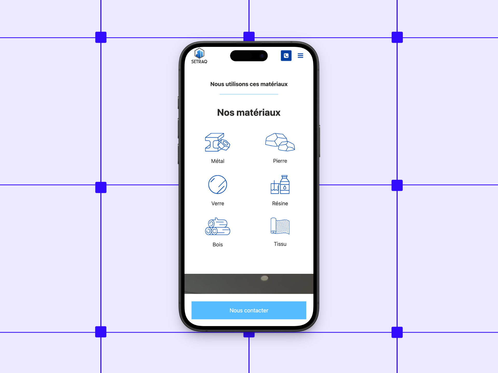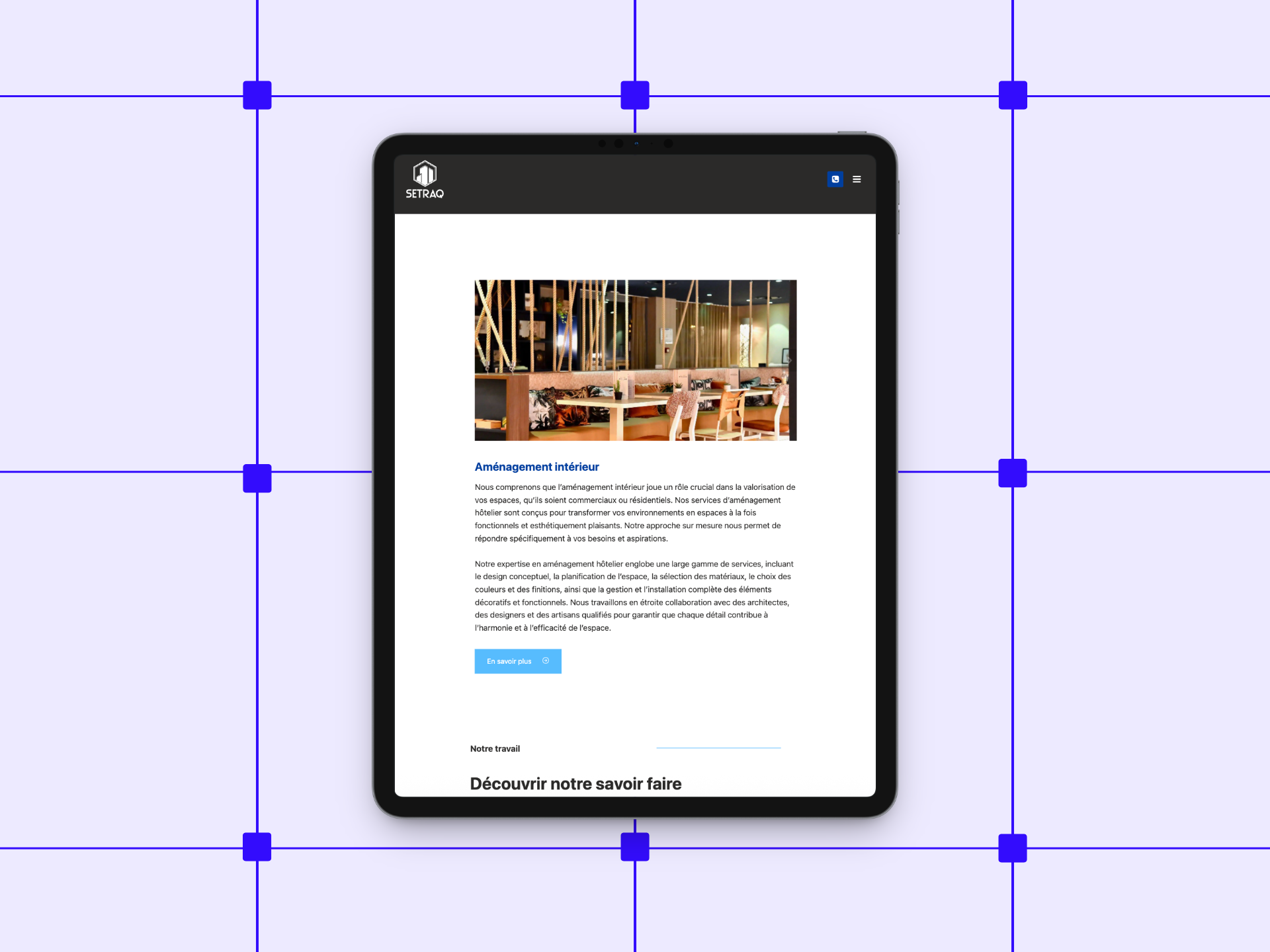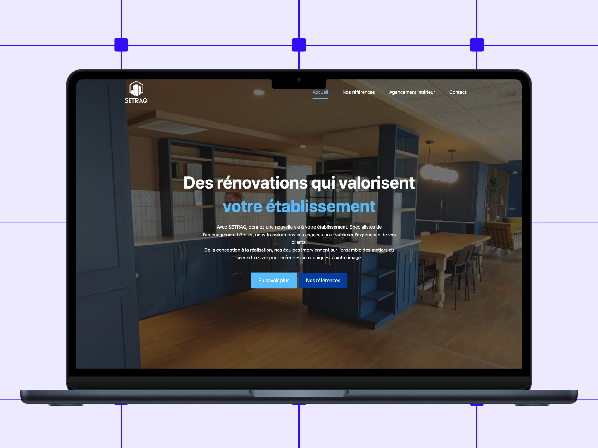 Développement du site internet avec l’agence Apollo Studio. C’est un site vitrine pour Setraq, une entreprise d’agencement intérieur pour les hôtels et apparts hôtels.